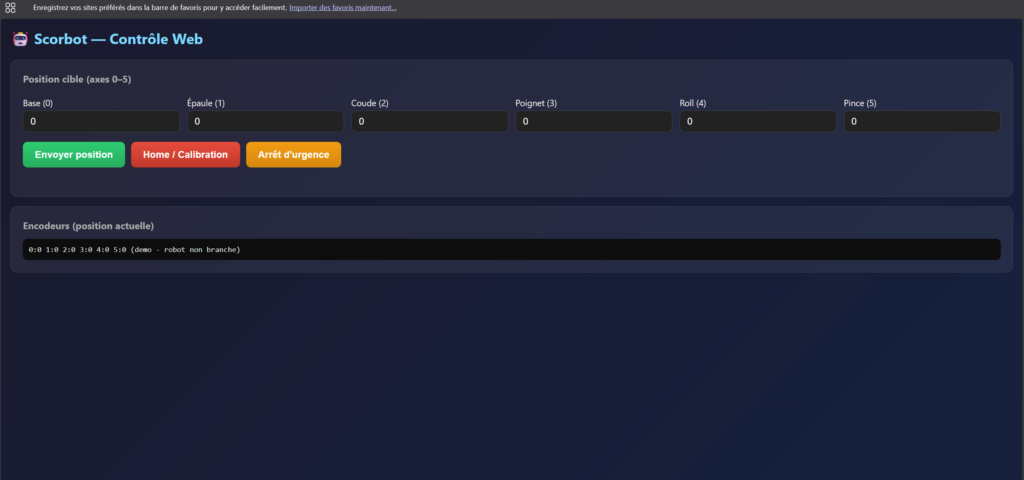 • Offrir une interface simple — une page web sur le réseau local : champs pour les positions des 6 axes, boutons « Envoyer position », « Calibration (home) », « Arrêt d’urgence », et affichage des encodeurs en temps réel.