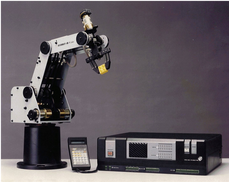 On s’est lancé dans la réhabilitation d’un Scorboter ER 5 Plus — un bras robotique éducatif des années 1990, conçu pour l’enseignement et les démonstrations. C’est un robot à 5 axes + pince (base, épaule, coude, poignet, pince), piloté à l’origine par le logiciel SCORBASE d’Intelitek, via une liaison série ou un boîtier dédié.