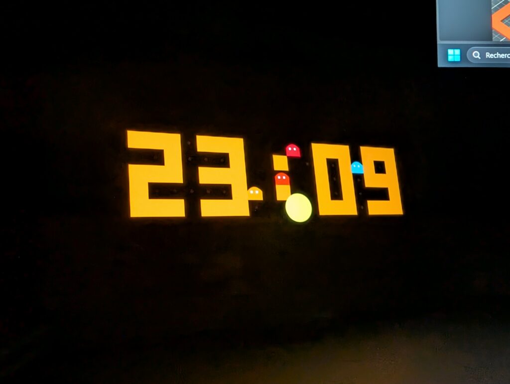 Le fil conducteur : l’heure se construit ou se met à jour comme si le personnage « activait » les pixels — d’où le côté jeu et la cohérence avec l’univers Pac‑Man.